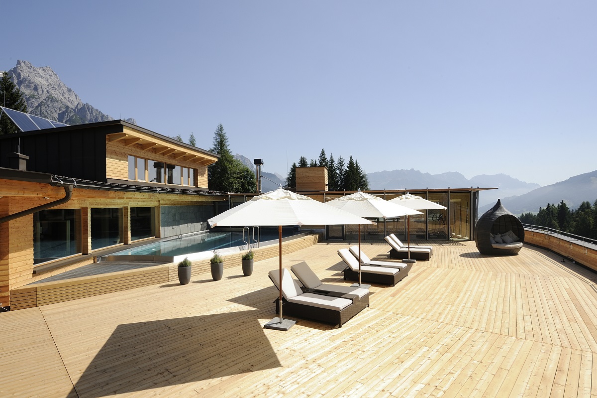 Kein Leim, kein Metall. Es sind mehr als 200.000 Dübel aus Buchenholz, die die massiven Holzwände in der Forsthofalm zusammenhalten. Und die wiederum bestehen ausschließlich aus heimischem, mondgeschlagenem Holz. Neben Nachhaltigkeit & Natur geht’s hier aber auch um lässig-alpinen Lifestyle. Vom beheizten Rooftop Pool überblickt man mit 360-Grad-Weitblick das mächtige Bergpanorama. Außerdem gibt’s auf der Dachterrasse regelmäßig live DJ Sound und Cocktails zum Sonnenuntergang.